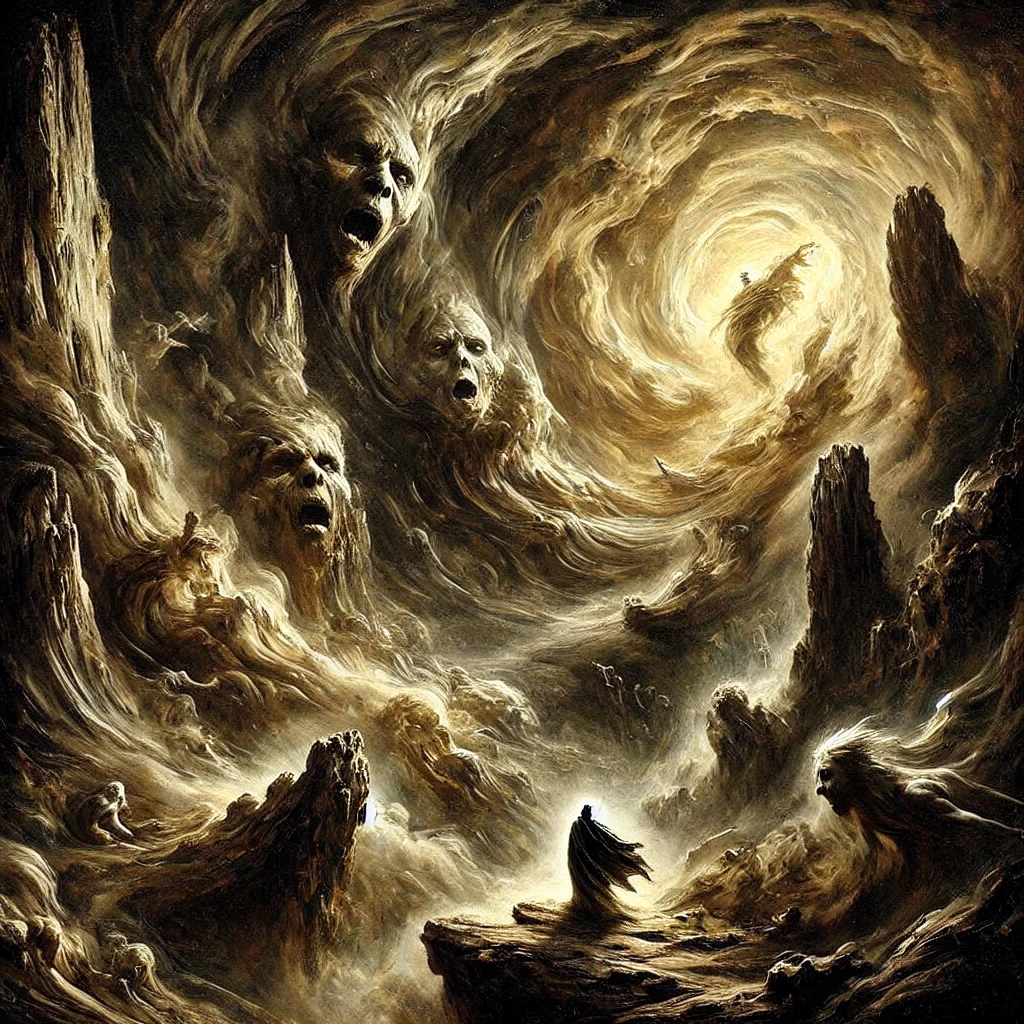 There is no one description of Pandemonium. Even among those who claim to have glimpsed its depths, no two accounts are the same, and few scholars believe a mortal being can travel to Pandemonium and return with their mind intact. A howling void of endless tunnels, a labyrinth of wind-carved stone, a realm where screams take form and shadows coil into laughter— these are but fragments of the descriptions found in Codex Maledictum, the most infamous collection of accounts from supposed planar travelers. If there is truth in such writings, Pandemonium is a realm of ceaseless wind and darkness, its tunnels stretching into infinity, its pathways twisting with no discernible pattern.