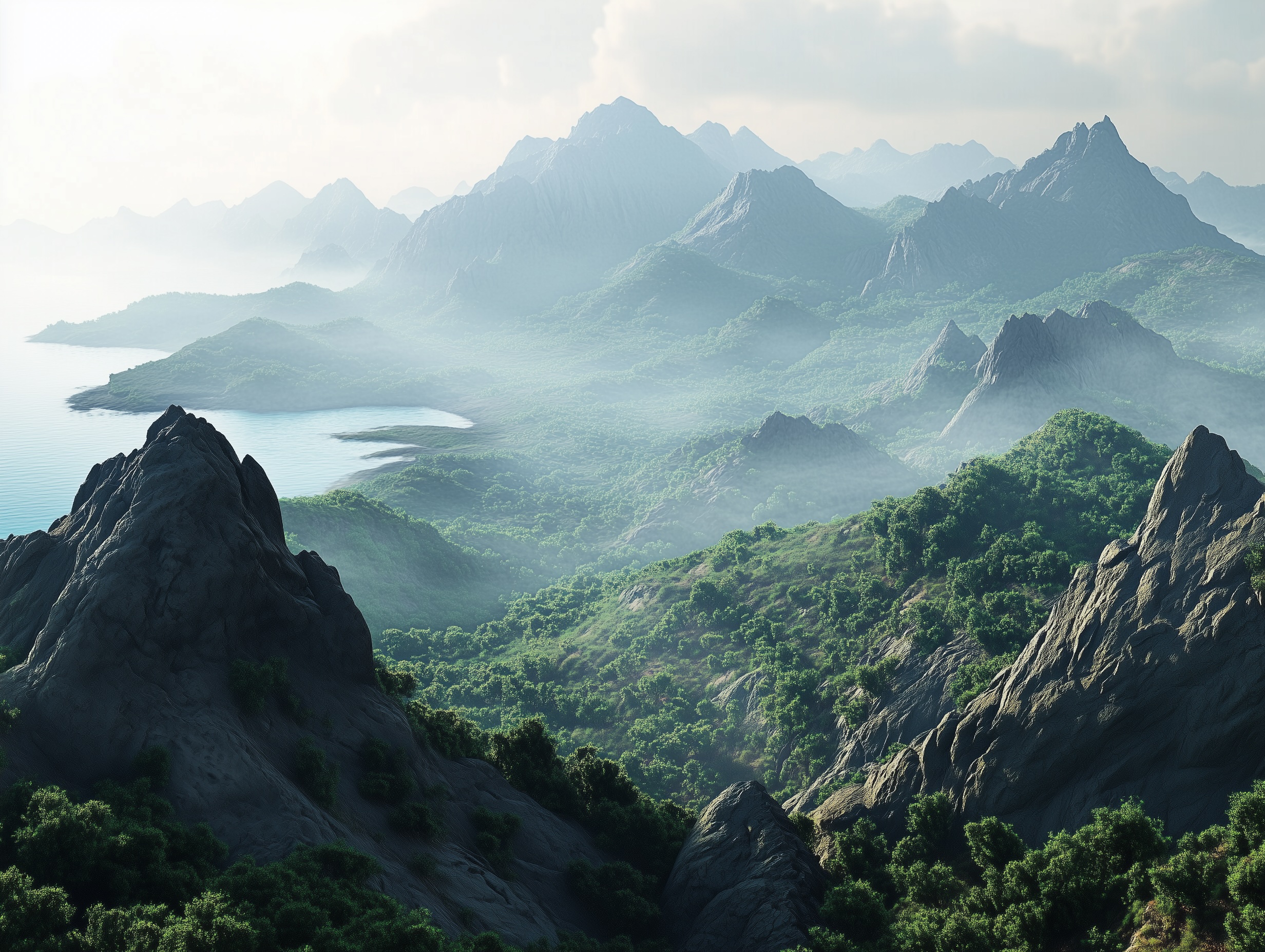 The Chataans are a rugged, rocky mountain chain that rise from the hills and cliffs on the northeast shore of the Nevos Sea, to a height of land at nearly 10,000 feet, blending lush forests with steep, exposed rock faces. Monsoonal rains create seasonal streams and waterfalls along the slopes, nourishing dense woodlands of teak and pine in sheltered valleys, that turn golden in the dry season.
