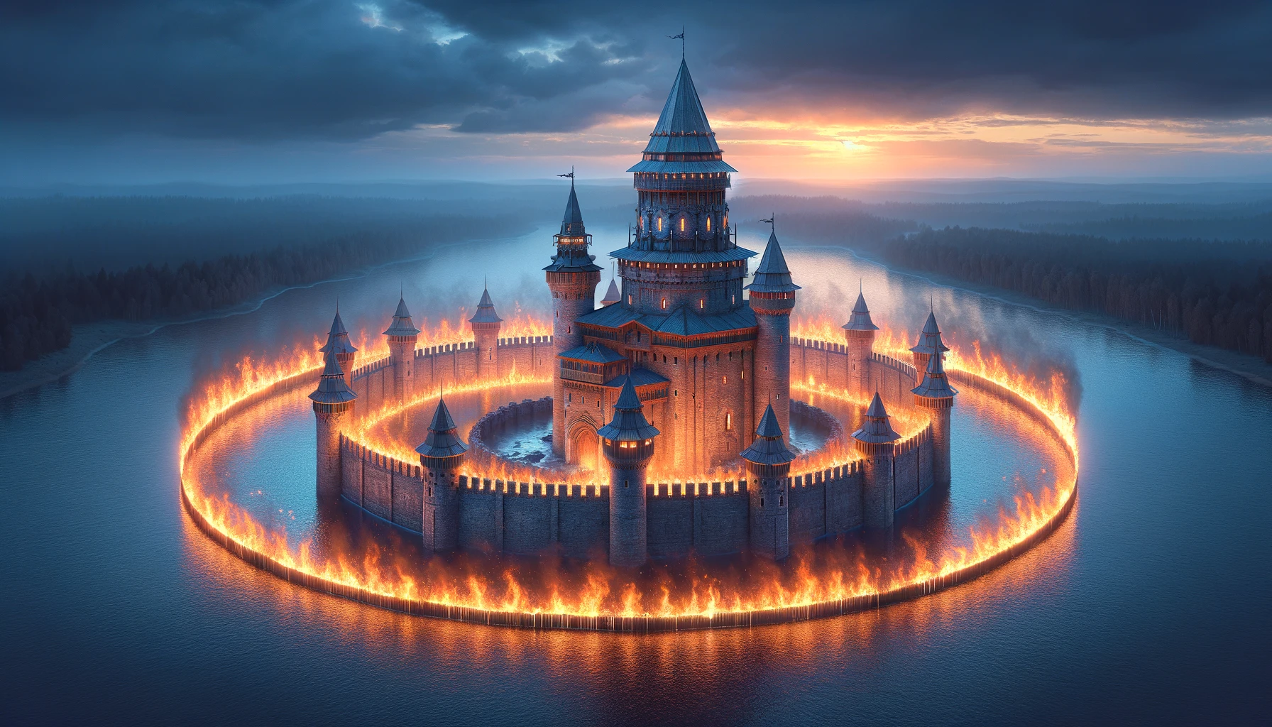 The inner keep sits on a small artificial lake, surrounded by a permanent wall of fire. The entire complex is surrounded by a wall of stone; a number of support buildings and other structures are located on the shore of the lake, and are used to entertain visitors, among other things.