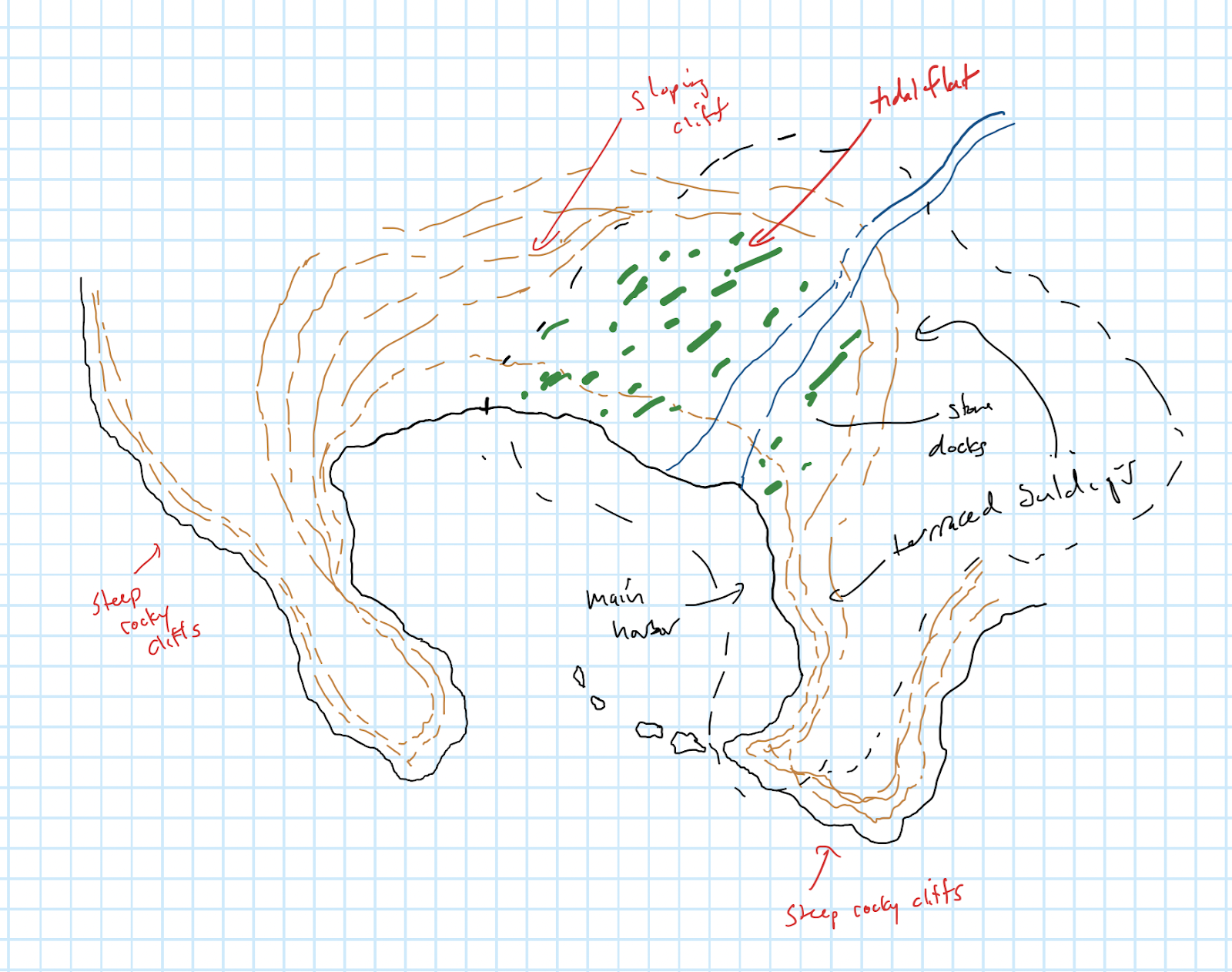 Near the top of the Cliffside District, set off the main road from the Low District, a wide, flat terrace opens up. This terrace looks like a massive gash in the side of the cliff, torn from the rock as if by some enormous creature or weapon. No one knows how it was made, but it is a perfectly smooth terrace, about 200’ by 200’, set on the side of the cliff. The ground sparkles – as if from flecks of quartz embedded in the rock – and it appears smooth and polished. The surface of the terrace seems undamageable, or at least, in hundreds of years nothing has seemed to scratch it. During the full moon, the sparkles seem to grow brighter, and at times, during especially high tides, they drift through the rock toward the ocean, almost like they are trying to go home.
