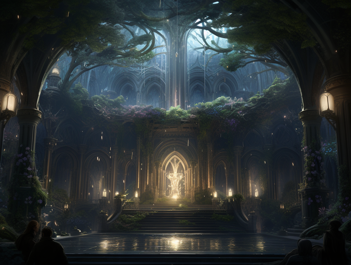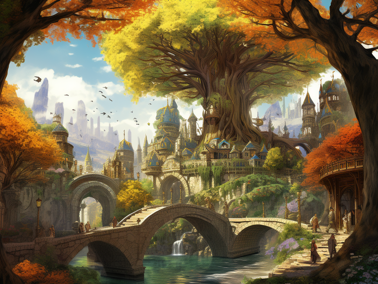 Erelion is a living city, growing in and among the ancient forest of Orenlas. Elaborate towers appear to grow from the surrounding trees and landscapes, their walls adorned with vines, leaves, and flowers. Bridges woven from living vines connect various parts of the city, allowing elves to traverse the canopy with grace. At night, the paths of the city are lit by bioluminescent plants and animals, their soft, soothing glow casting a dreamlike aura over the city.