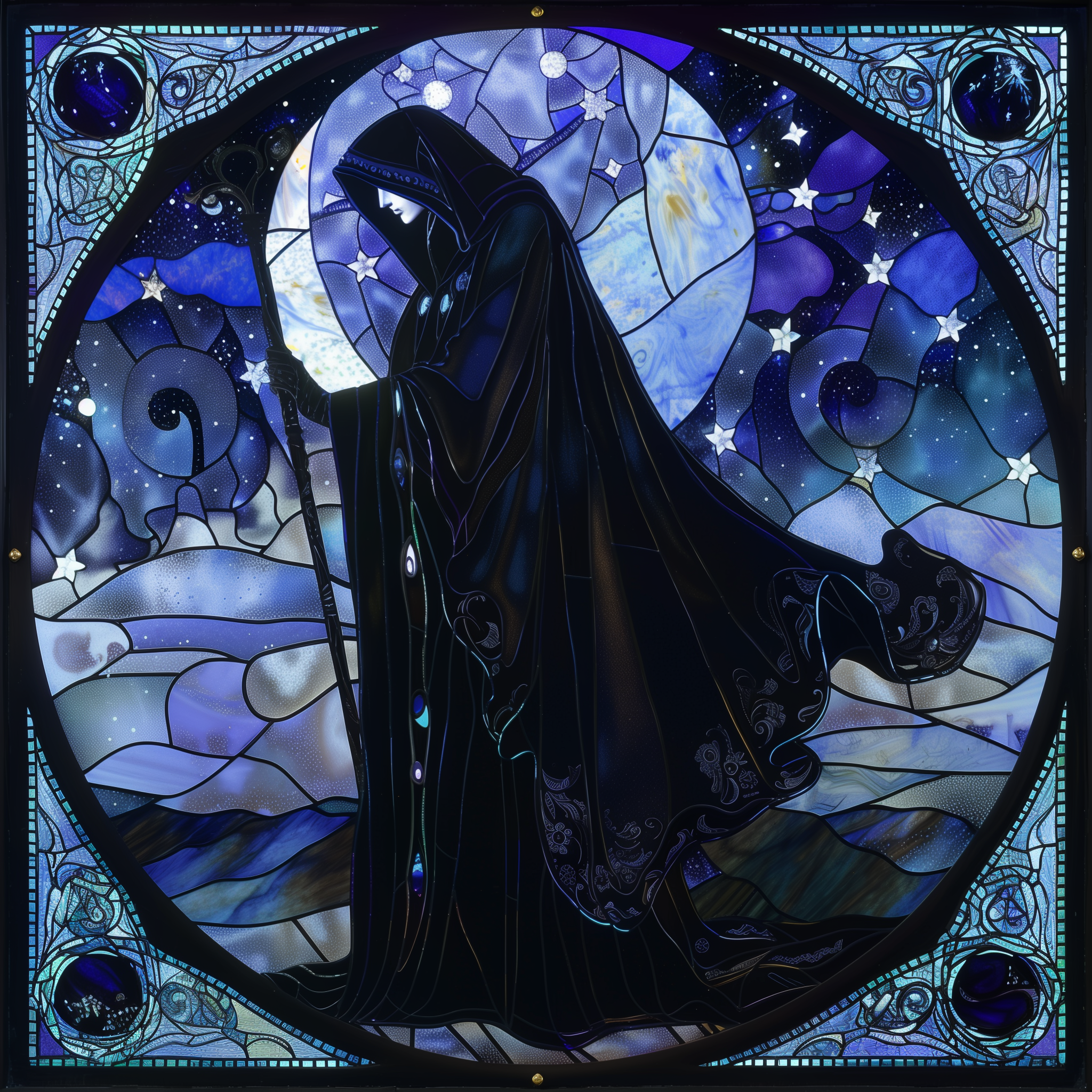 The Night Queen is usually depicted as a pale woman, often of indeterminate age, often old. She is usually depicted wearing black robes, and with her face cloaked in shadow, often leaning on a cane. She is the Goddess of darkness, death, and sleep, especially associated with the transition from life to death, and the much rarer transition back to life again. She is the defender against undead and the unnatural extension of life, and associated with the night, and winter, and the virtue of compassion. She watches over funerals, and keeps the night safe.