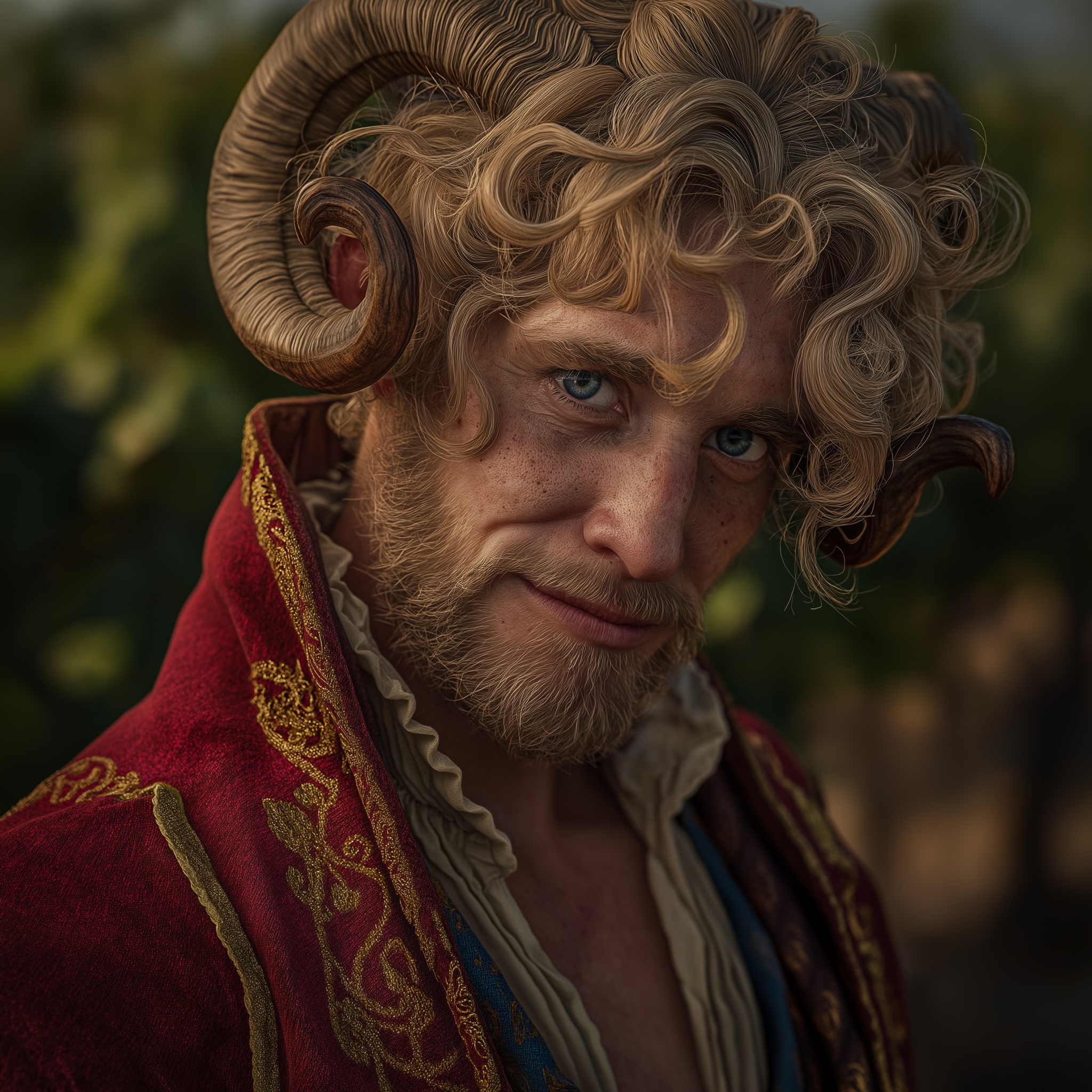 He is lean and rakish, with curling ram’s horns wrapped in gold rings, and half-buttoned silk shirt. His eyes twinkle with mischief he can no longer act on, and his mouth twitches constantly, but whether in irritation or the desperate effort to hold his tongue is hard to tell.