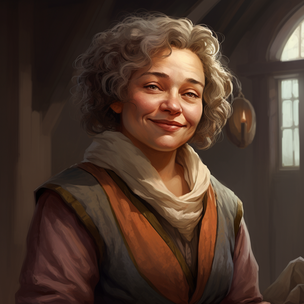 Chenna Goodbarrel owns a small and charming halfling tavern in Fairgate Outer called The Singing Fox, with her wife Harriet. Chenna runs the bar and kitchen; warm, welcoming, and charming, she’s the heart of the establishment.