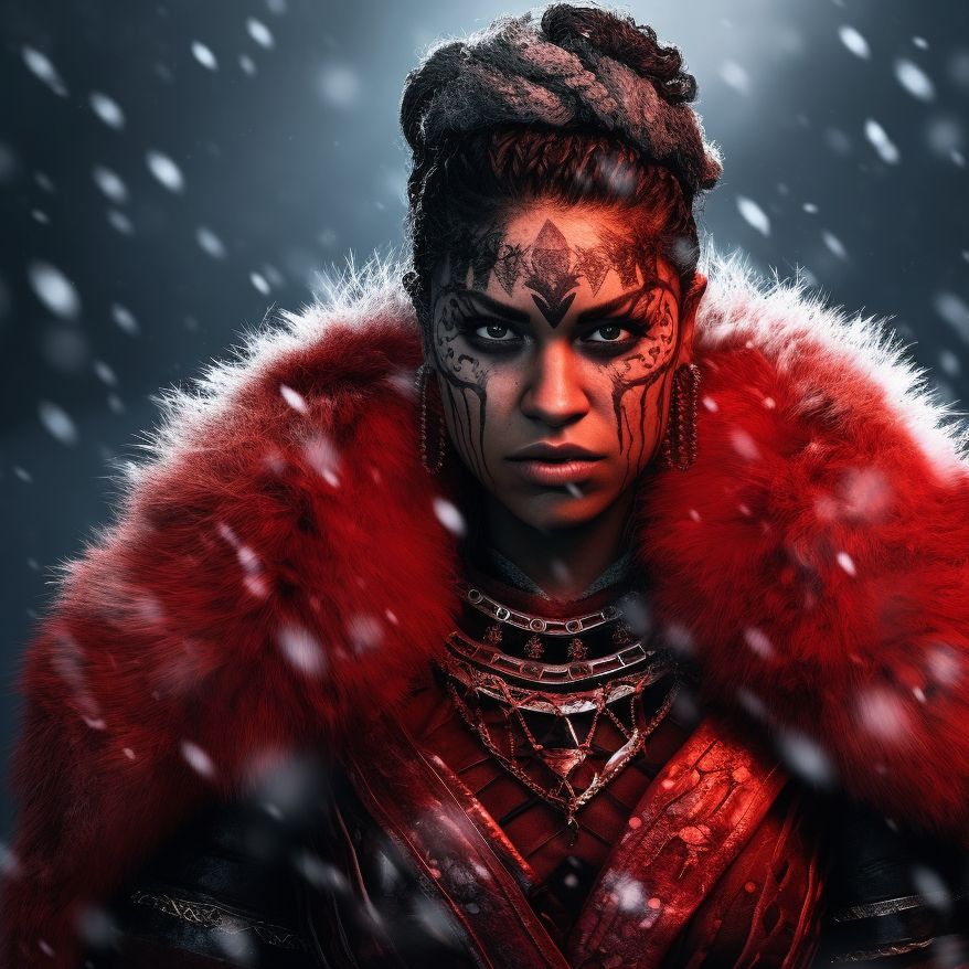 She is a very tall, dark skinned woman, with bright red facial tattoos in place of the blue that most priests wear.